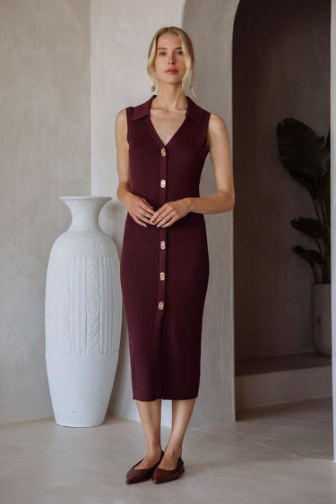 Burgundy Sleeveless Midi Dress with Gold Twist Lock Buttons