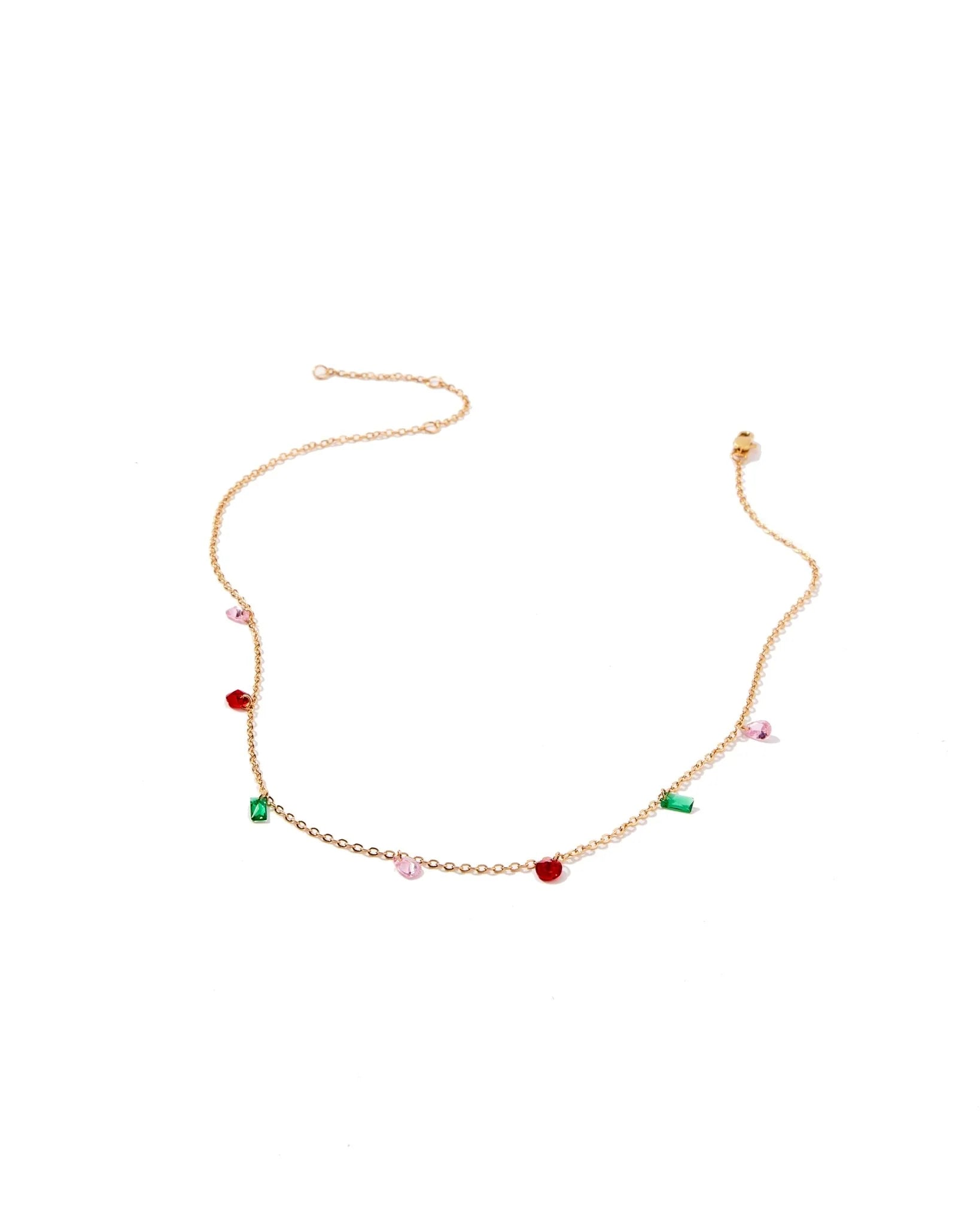 Celebrate the season in style with the Allegra Holiday Necklace, a festive design featuring a gold 16–18 inch adjustable chain adorned with vibrant red, green, and pink crystal charms. Each charm sparkles with holiday cheer, making this necklace the perfect accessory for adding a touch of color and joy to your winter looks. Lightweight and versatile, it layers beautifully with other chains or makes a chic statement worn solo.