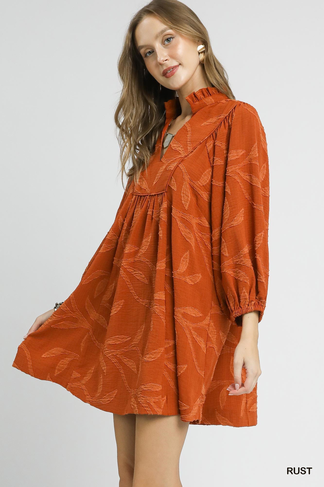 Umgee Rust Color Jacquard High Ruffle Neck Dress