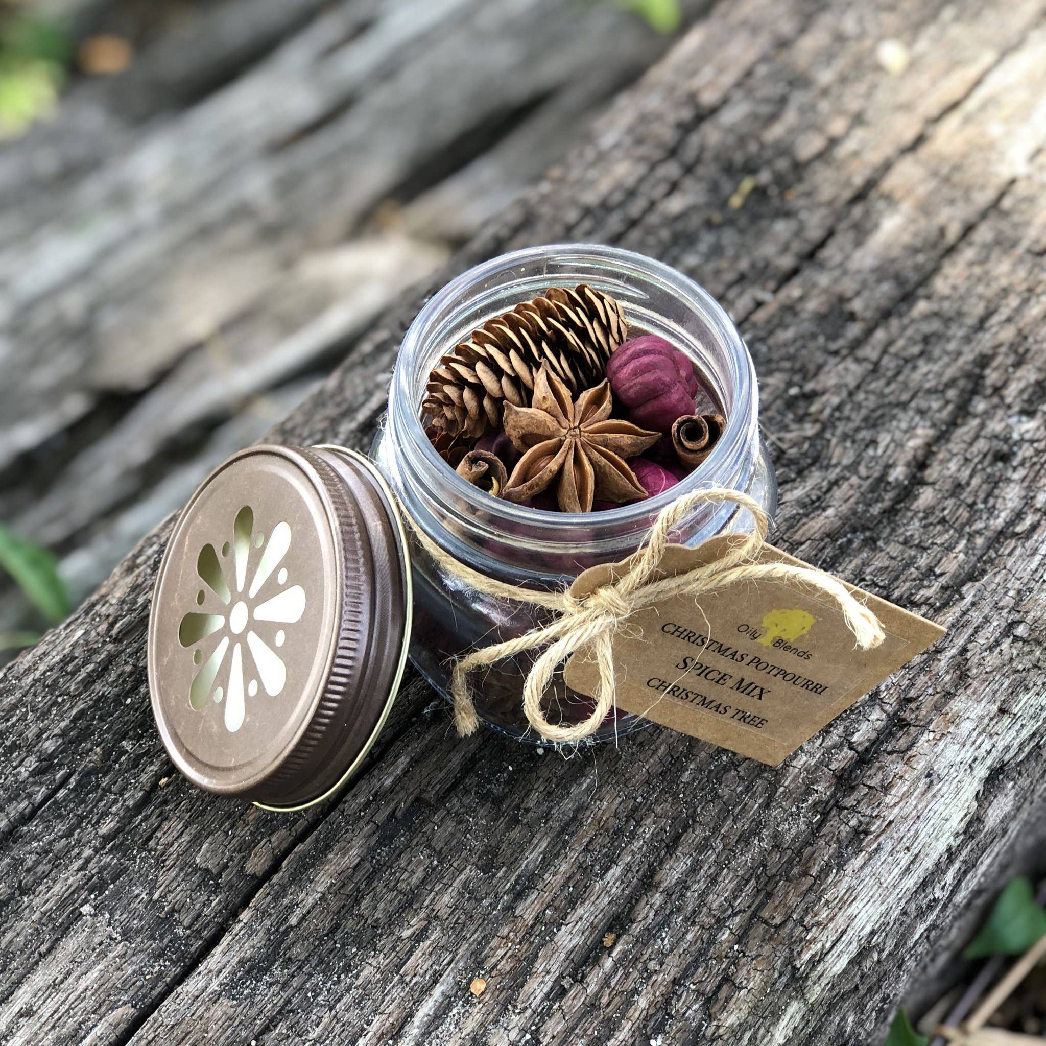 Mix includes: dried cinnamon, clove, mini red pumpkins, star of anise and mini pine cones. Lids are vented to allow fragrance to fill the room. Jars are glass, and packaged with twine. Scents Victorian Christmas ~ A blend of green pine, clove & soft florals Christmas Tradition ~ Mix of orange, cinnamon, nutmeg & vanilla Apple Pie ~ Mix of crisp green apple & a delicate mix of spices & sugar Cranberry Delight ~ Sweet cranberry, apple & vanilla Christmas Tree ~ Sweet green fresh cut Douglas Fir Creme Brulee - Rich buttery cream, sweet vanilla & caramelized custard Gingerbread ~ Sweet spicy cinnamon, ginger, clove and nutmeg Cinnamon & Balsam ~ Warm festive cinnamon with hints of fir balsam Holiday Sparkle ~ Blend of spruce, apple, cranberries, grapefruit, cinnamon, and clove Hollyberry ~ Notes of green fir and sweet berry Essential Oil Blend ~ a mix of pure clove, cinnamon and orange essential oil Unscented ~ ready for display or adding your own essential oils or fragrance