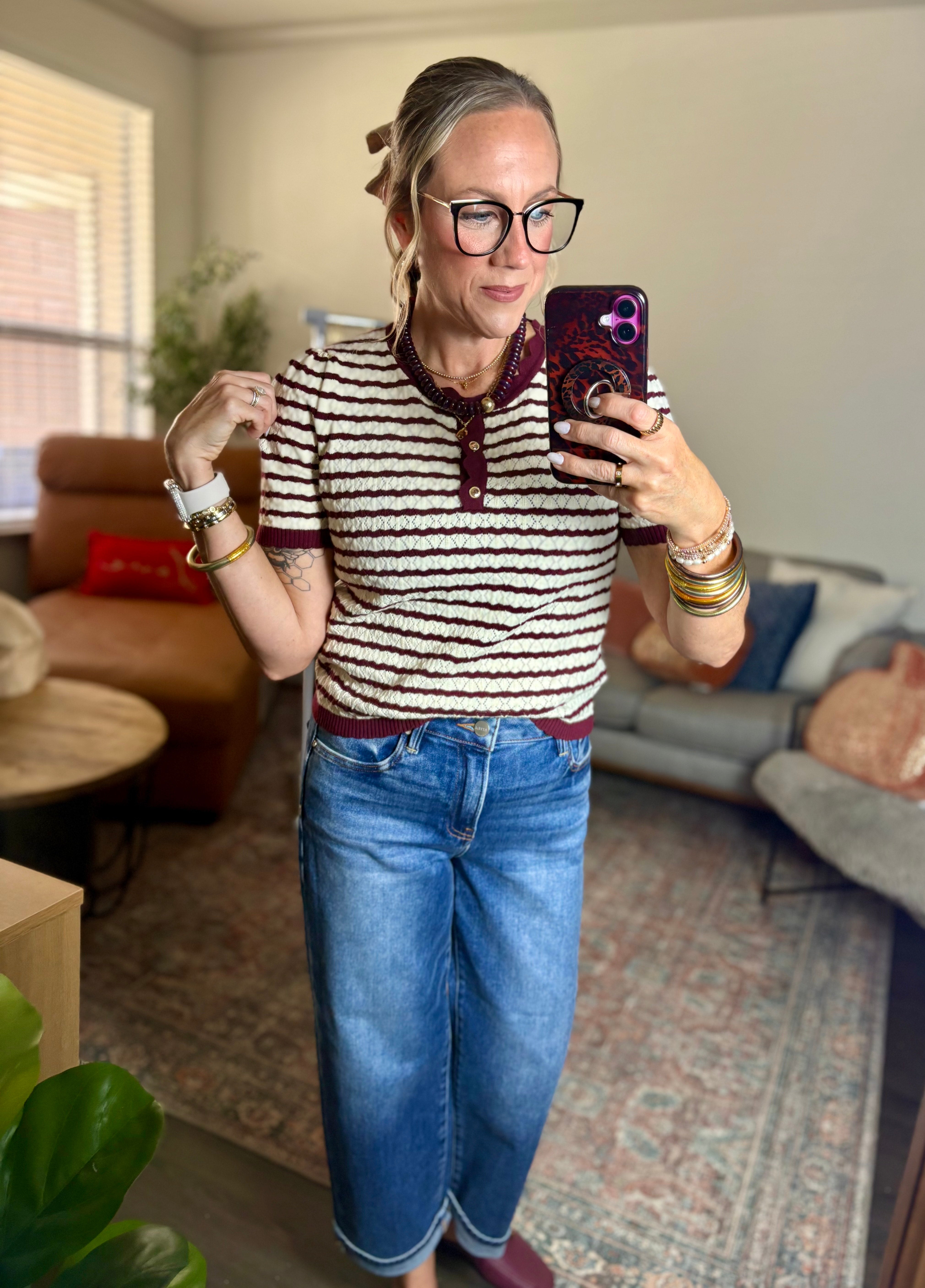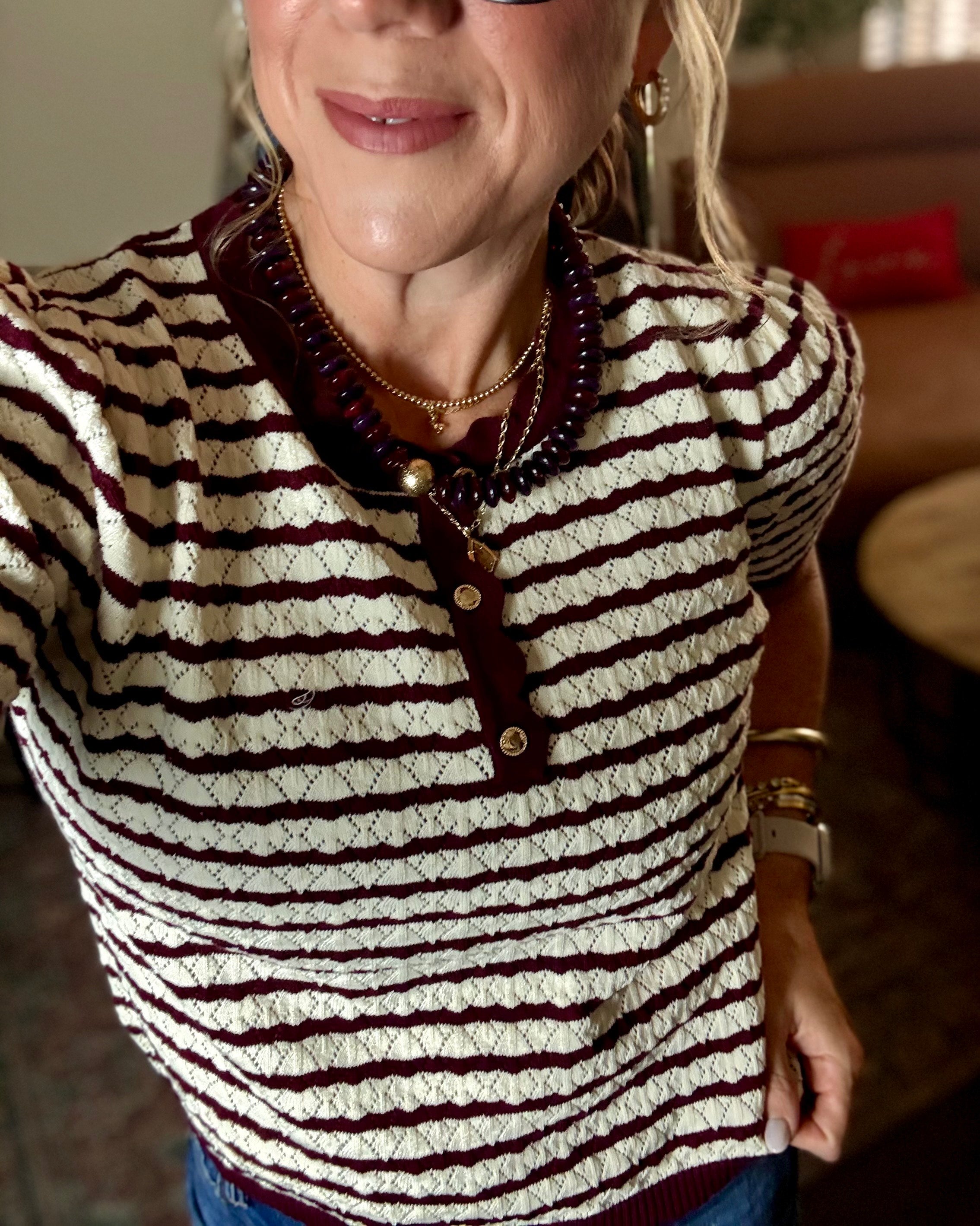 Entro Stripe pattern short sleeve pointelle sweater knit top featuring scallop edge finish detail. Button front closure. Unlined. Knit. Semi-sheer. Lightweight.