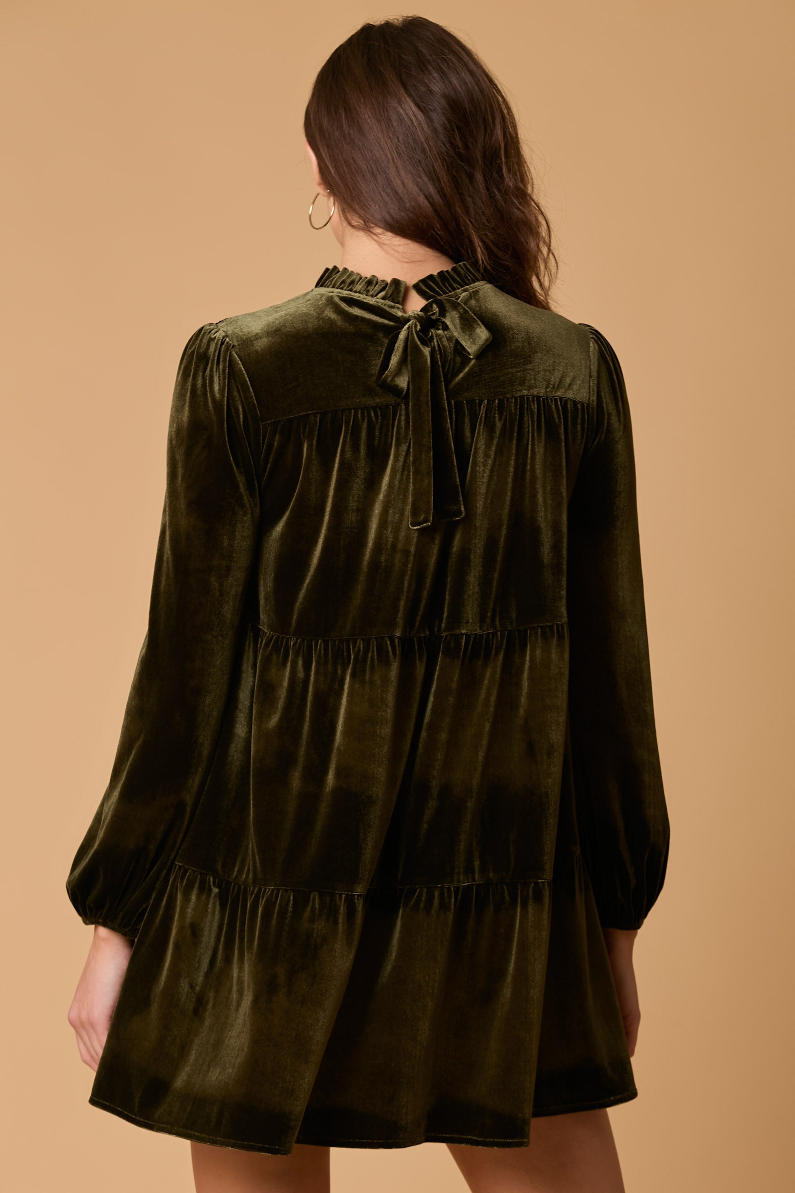Fantastic Fawn Velvet Long Sleeve Mini Dress in Dark Olive Green - Tiered - Mock neck- Back ribbon tie detail
