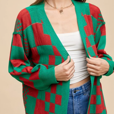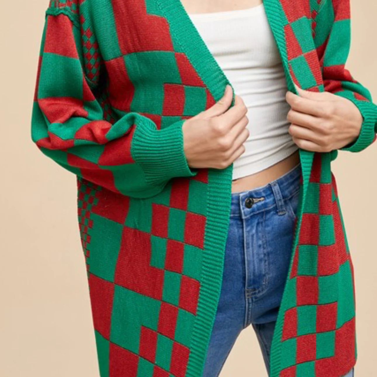 Festive Red & Green Cardigan perfect for the Holiday Season. Longer in length and oversized.