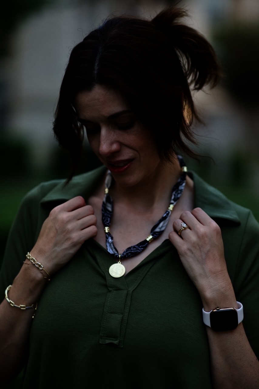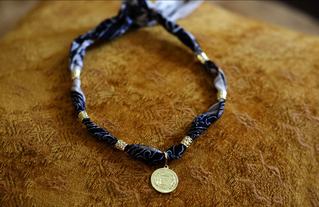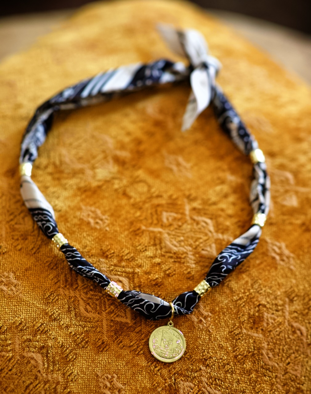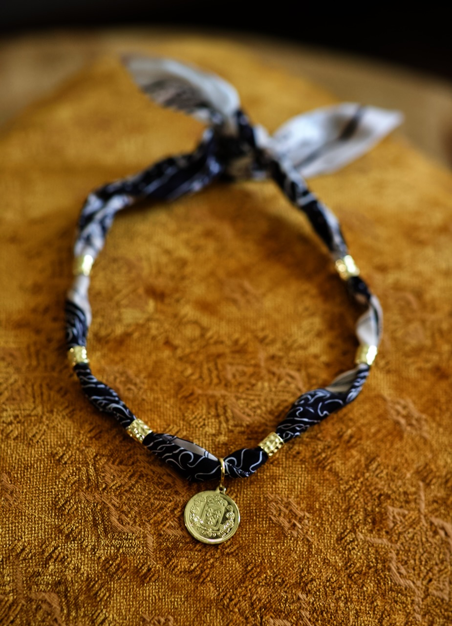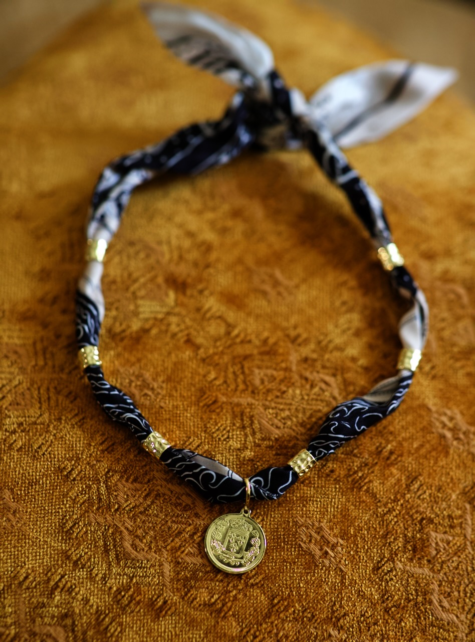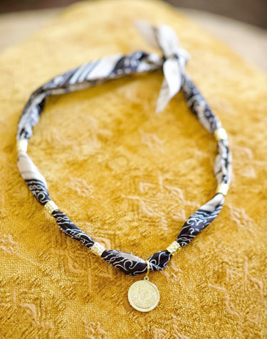 Black and tan colored scarf necklace with gold spacers and gold stamped coin charm.