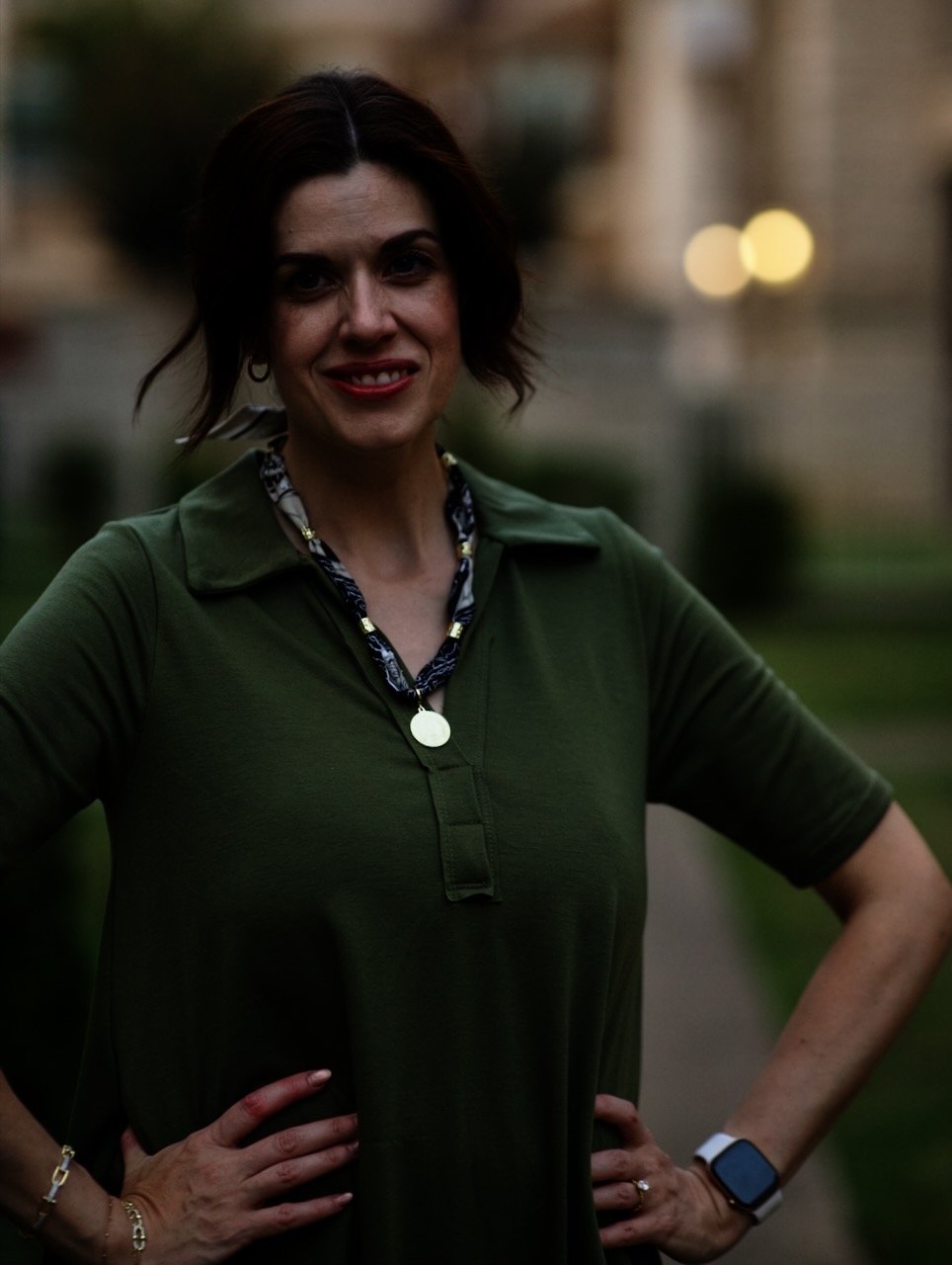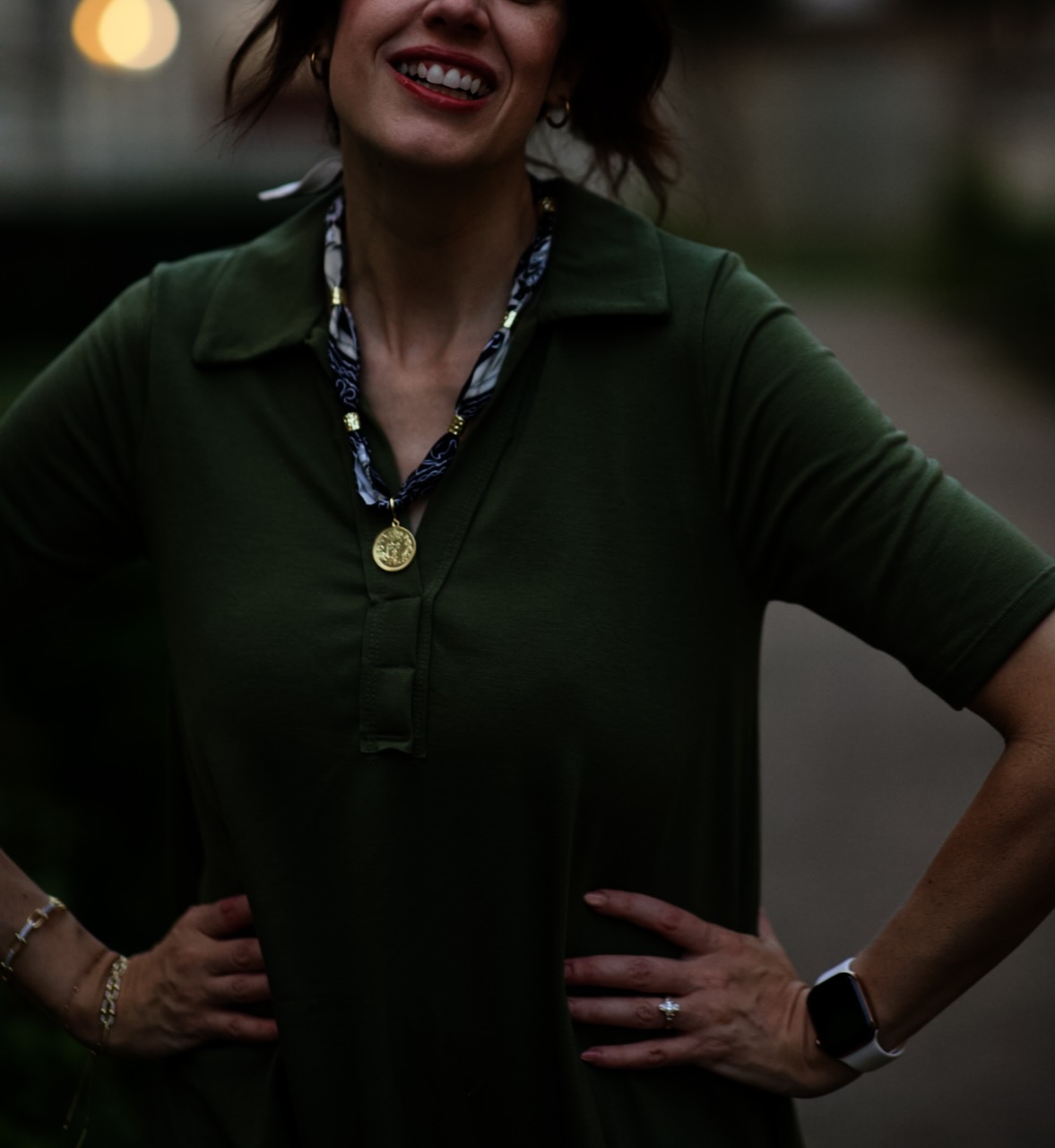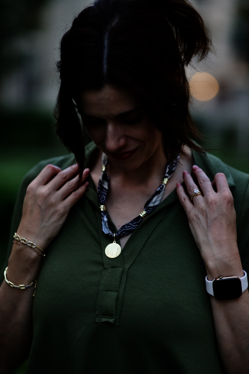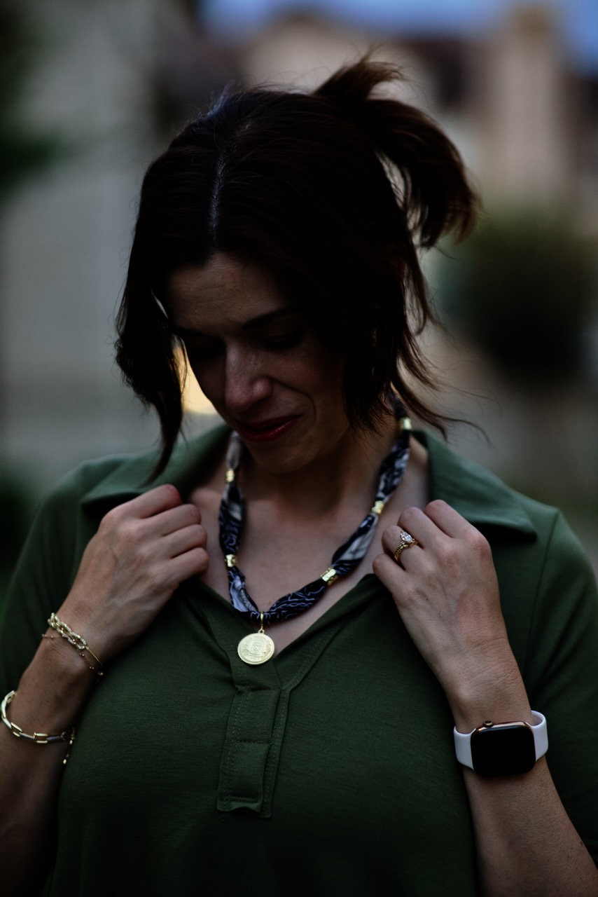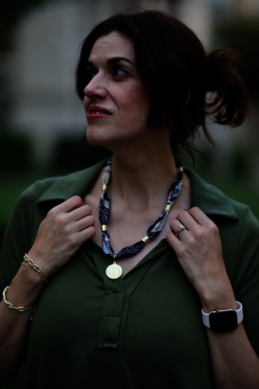 Black and tan colored scarf necklace with gold spacers and gold stamped coin charm.